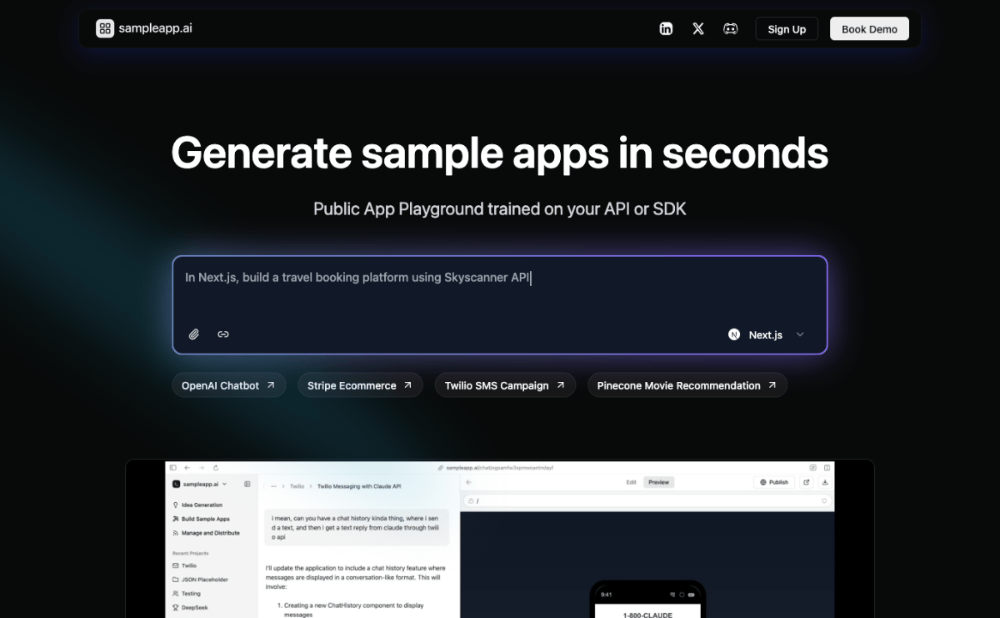 SampleApp.ai is an AI-powered platform that helps developers and companies quickly generate customized, sales-ready demo apps using their own API or SDK documentation. With features like real-time sync, pre-built playgrounds, trend-driven app ideas, and custom training, it streamlines the creation of tailored sample apps for use cases like developer advocacy, sales demos, and onboarding. Designed to reduce development time, it reflects the modern shift in priorities—focusing on rapid sample app delivery over initial API calls.