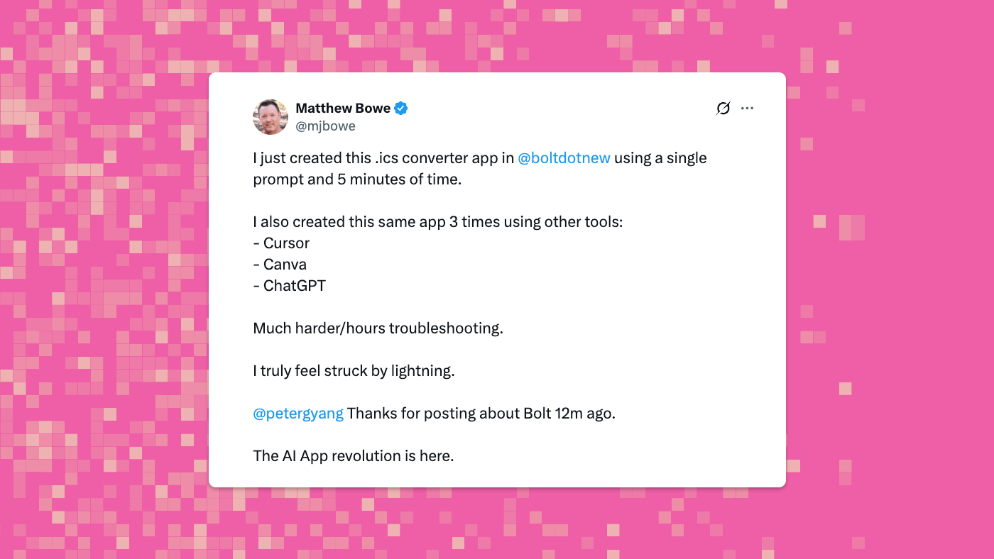 Instead of searching for a solution online, Matthew Bowe just built his own ICS converter app for internal use with bolt.new. This tweet really shows the power of Vibe Coding.